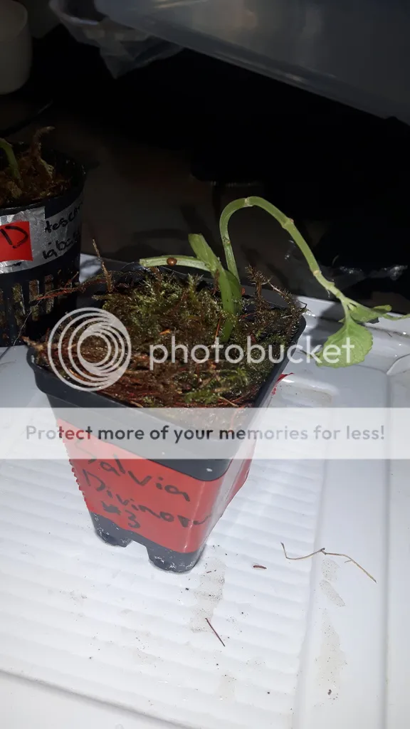 Salvia Divinorum:Well I have been chasing this plant for a few years now. It's a special plant to this Skunk as I had one of my most profound psychedelic experience, I'd like to be able to one day experiment with this plant and with the Alkiloid present in this plant. The experience left me wanting to revisit. She's not the easiest plant to aquire where I am. I had a chance last year when I was gifted a cutting. That one cutting I grew for 4 months and tuned it into 4 separate plants. But unfortunately I was away for 6 days at the hospital when our newest baby was born and lost all my Salvia Plants. Just last weekend 'Saturday' I was able to snag one nice cutting I turned into 3 cuttings. These cuttings are going on day 5 rooting. So hopfully within another week I should have some roots beginning developing. Rooting:-I like to root Salvia Divinorum in straight Spagnum Moss made for reptile enclosures. -tuck them under DIY humidity dome and mist and provide FAE twice a day. They are set under a t5 florescent grow lamp receiving filtered light. 5 day old Salvia Divinorum cuttings:  Cutting #1   Cutting #2   Cutting #3   Humidity dome:  Skunk The best time to sow a seed was 5 years ago.... the next best time is right now.