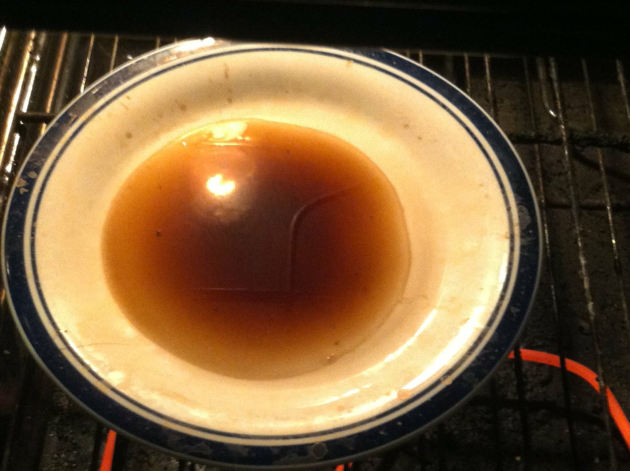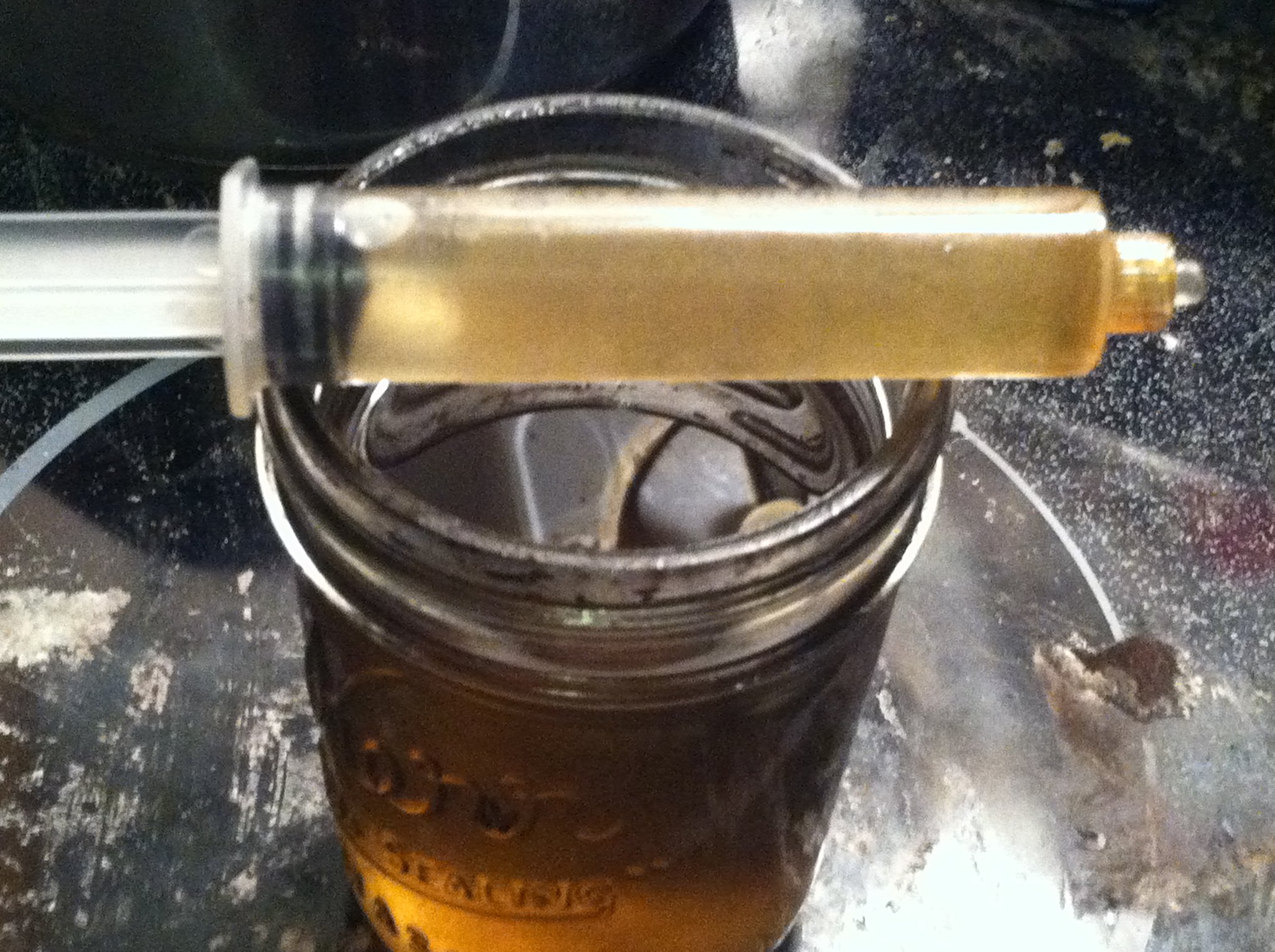 I left the H. hostilis powdered root bark sit in sulfuric acid for a couple days, shaking off and on. Filled mason jar with enough acid so that it was 1/3 bark 2/3 acid. This gave a DARK red (black) sludge and red fluid (separated). coffee filtered fluid to get red fluid only. took sludge and placed in fresh acid. Confirmed red fluid is acidic. Next added the sodium carbonate (made by heating sodium bicarb at 500*F for >30min) Na2CO3 was added until solution stopped fizzing. formed a thick gray fluid, but very viscous, not thick, did not resist stirring Confirmed fluid is alkaline. after setting there were then two layers...no siphoning or filtering done here. Next added (all to same container) acetone and vigorously shook. This left three distinct layer; bottom appeared to be Na2CO3 gray material, middle layer was black sludge, top layer was tan/brown acetone...resisted stirring a little. Acetone siphoned off, filtered...only clear layers were kept.  the syringe is for NS but was emptied, filled straight from mason jar, but it shows how it appears...in my's opinion...quit diluted. I placed a plate with a pool of brown acetone and a mason jar half filled with brown acetone in the oven set to 280*F and as dry layers appeared around edges of fluid on the plate warm fluid from mason jar in oven was lightly applied to edges...this caused the center to grow darker and darker, the edges remained nearly clear (until dried, then brownish) Here is another pic...This was done 5-7x's so far btw...the plate is flat, the outside is freshly added dilute solution, the center is not more fluid but more concentrated.  curious 1. what exactly do I have here? DMT dissolved in acetone? Forming fast flakes of dmt crystal from fast evap? 2. By darkening the center through evap really concentrating dmt levels in the center? If yes How much darker should I let it get? If no should it go through a fresh acetone/coffee filter bath top layer only pull off? If no...does it really affect the end viability? 3. can I place these concentrated "flakes" and place with some tobacco or other herbs and smoke or will it need to have its form altered again. 4. I'm assuming this will form a yellow sludge, yes 5. can it be smoked as is once the acetone dries out? Appreciate any help