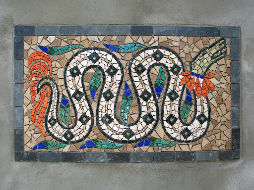 The mosaic is made with marble, slate, and ceramic tile, mostly odds and ends I've been hauling around for years. It's really been a fun project and gives me something to do with all my extra $$