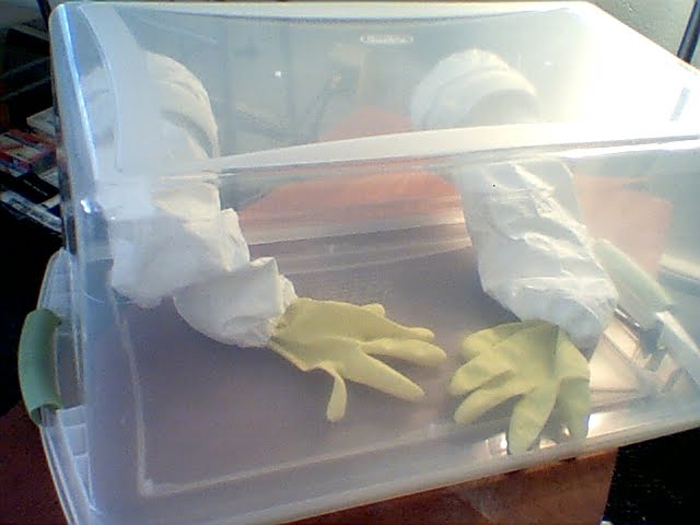 So after our pressure cooker has cooked, we would clean out our glove box with bleach, peroxide and alcohol, then place the pressure cooker close to the box and then quickly move the cakes, wearing gloves of course, in to the box and close the lid, make sure you place the syringe in there along with some kitchen tissue and alcohol.