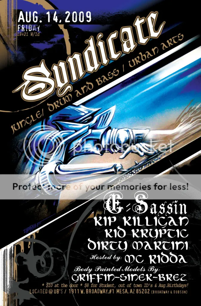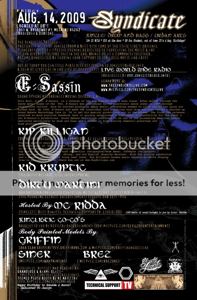 Yeuh, yeuh my ninjas! Droppin' hot fire on the Phx, AZ valley August 14th, 2009 it's The Syndicate Live in effect in the place to be ---> Mesa, AZ! Can't manage to book a trip down to beautiful, arid, 110+ degree Phoenix, AZ in August? No problem, fam! Tune in to our live webcast via JunglistRadio.info the night of the event!