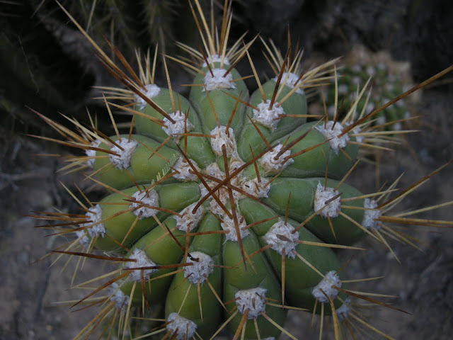 I was fortunate enough to travel to the foothills of the Andes in Argentina to visit Trichocereus terscheckii with a contemporary "cactus practitioner." This cactus, he told me, was medicine for the heart. The ancient people, he said, would traverse the Andes solely on San Pedro and water. His technique was beautifully simple. I am honored to share with you his technique and these pictures. Please treat this information with respect. Here are some pictures to illustrate the process. Here is a link at the bottom to a video showing how he removed the spines: http://www.youtube.com/w...f_8&feature=youtu.beWe arrived before sunrise and left as the sun was setting. The whole day was spent tending to San Pedro.    Placing a small amount of tobacco and dirt to "facilitate healing" of the cactus.  The top of the arm used is grafted onto the base to allow continued growth.   The cut "arm" is ready for despining. The video above shows a genius method for despining. After the spines are removed, the core is removed and angular cuts are made parallel to the skin, cutting the white material away from the green material under the skin. The "ribs" are separated from each other and chopped to yield chunks with green flesh attached to the skin. These chunks often have the fluffy aereoles and the base of broken spines. These are included in the final product.   These chunks are then dried by fire. Further drying takes place either by a fire or in the sun. These chips are crushed by hand and then lightly boiled for 45 minutes to an hour to produce a mild, fresh and somewhat flowery tea with considerable potency. For best taste, the tea should be thoroughly dried, in which case they become brittle and the green taste dissipates to leave the true subtle flavor of this cactus. Small amounts of ash and dirt are considered "good for the medicine." As the chunks dry, they often become mottled a with rust color.        Cact Eye Watch Cheers to the Nexus.