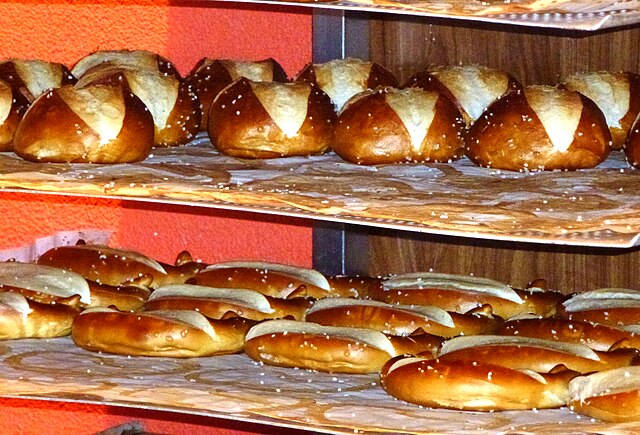 Lye rolls are a baked specialty in Germany (especially in Bavaria and Swabia), Austria, and Switzerland. They are made by immersing bread rolls in a lye solution before baking. The German name is Laugengebäck for any baked good dipped in lye.